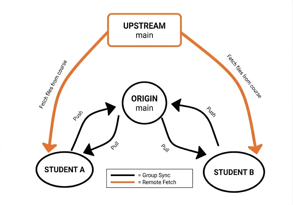 - When new assignments are released or course files are updated, fetch and selectively check out the files you need: