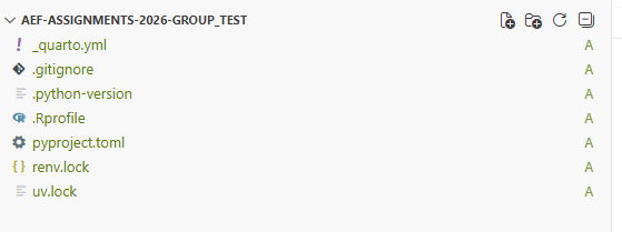 git checkout upstream/main -- renv.lock uv.lock .Rprofile pyproject.toml _quarto.yml .python-version .gitignoreThe files will appear in Positron’s file explorer. To copy an entire folder, use git checkout upstream/main -- foldername/.