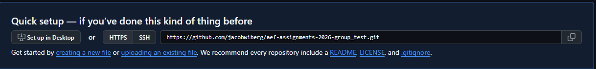 Name your repository (e.g. “AEF-2026-Assignments-Group1”), add a description, and set visibility to “Private”. You do not need to initialize with a README or .gitignore. Click “Create repository”.