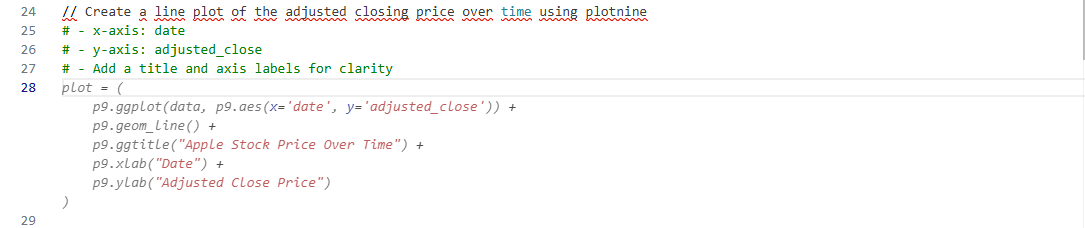 It is also possible to give code suggestions by writing // followed by a text prompt, which will trigger the assistant to generate a suggestion based on the prompt. This is particularly useful for generating code, if you’re e.g. unsure about the syntax for a specific function or package.