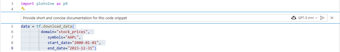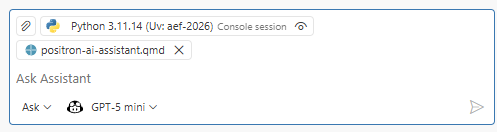 In addition to the main chat interface, Positron also offers an inline chat feature. This allows you to use the AI assistant directly within your code or text editor, without needing to switch to a separate chat window. You can access the inline chat by Ctrl + i (or Cmd + i on Mac) while your cursor is in the editor. This will open a small chat interface where you can ask questions or request assistance related to the code or text you’re working on, which is ideal for assistance with very specific lines of code, e.g. “Write documentation for this function”, “Explain this line of code”, “Rewrite this as a function instead”, etc.