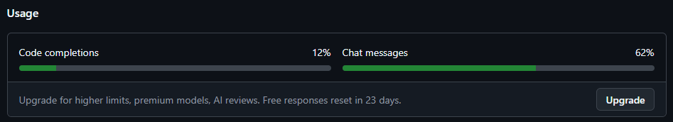Note that for the standard free setup (Copilot Free plan through Github), there is a usage limit which you may find on GitHub.com under Copilot settings