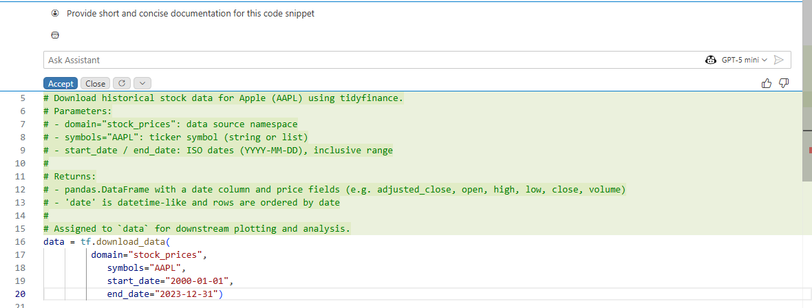 Exercise: Try asking the assistant “Can you summarize the main essential equations I need on mean variance portfolio optimization?” in ask mode, and then switch to edit mode to ask it to “Write a function that calculates the optimal portfolio weights based on the mean-variance optimization framework”.