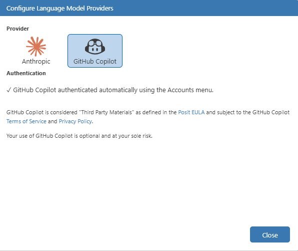 I’ve chosen to use GitHub Copilot. To connect with your GitHub account, press Ctrl + Shift + P and write Positron Assistant: Configure Language Model Providers. Select GitHub Copilot and press the Sign In button to initialize GutHub’s OAuth authentication flow. Follow the instructions to log in to your GitHub account and authorize Positron to access your Copilot subscription. After successful authentication, you should see a confirmation message in Positron.