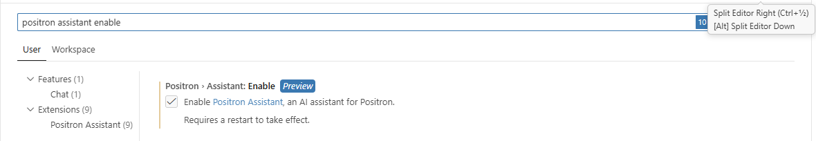 To set up the Positron Assistant, you will first need to enable it in the Positron settings. You may either click on the Chat tab at the left side bar (Ctrl + Alt + I) and enter the settings through there, or by clicking the small gear in the bottom left corner (“Manage” -> “Settings”). Write "Positron Assistant Enable" in the search bar and check the first box.