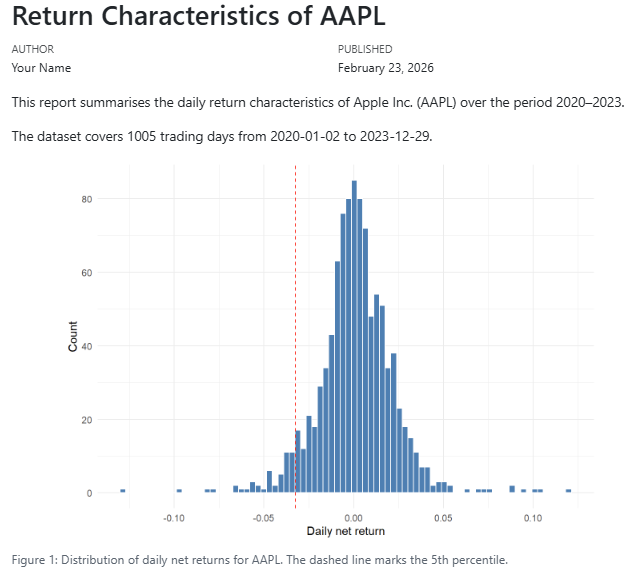Suppose you are asked to write a short report on the return characteristics of Apple stock (AAPL) — either for a research project or for a portfolio manager who wants a quick data-driven summary. The report should show the price history, the distribution of daily returns, and a table of summary statistics.