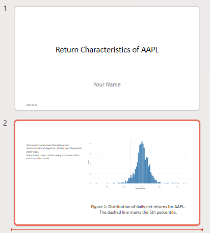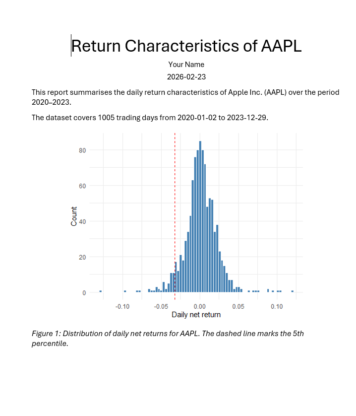 You write the code in R or Python (or Julia), it works, and you copy the plot and the numbers into a Word document. You send it off. Your supervisor reads it and asks two things: can you extend the sample back to 2015, and can you add a line in the histogram that marks the 1% quantile instead of the 5%? Small changes — but now you have to re-run the code, find the right figure in the output, replace it in the document, locate the numbers in the table, update them by hand, and hope you did not miss anything. If this happens three times across a two-week revision cycle, the manual overhead adds up fast and the risk of inconsistencies grows.